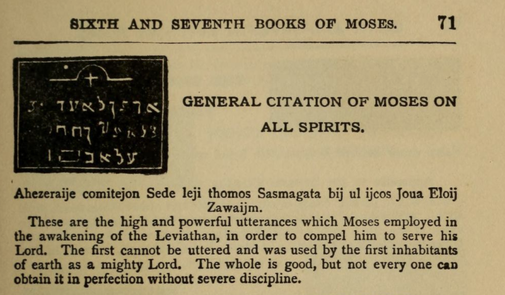 Most well known as a monstrous sea serpent mentioned in the Bible, Leviathan appears as a spirit in grimoires (books of magic spells) including the Grimoire of Pope Honorius, the Book of Abramelin, and the Sixth & Seventh Books of Moses.